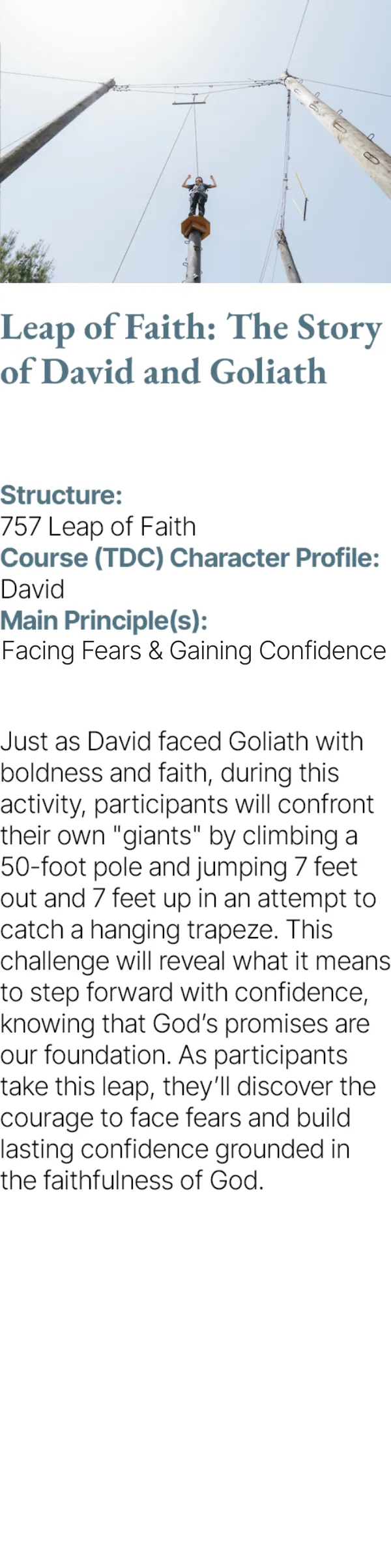 Our carefully curated curriculum combines experiential learning with biblical narratives, grounding participants in history while encouraging them on their own leadership journeys. As groups take on our state-of-the-art high adventure ropes courses, our skilled leaders guide them through heart-pounding activities based on the lives of Moses, Joshua, David, Joseph, and Abraham. After each challenge is completed, participants are led in a time of reflection and application. Through every challenge, reflection opportunity, and moment of growth, participants will gain a deeper understanding of God’s purposes for their lives and the strength to walk boldly into them! Find out more about our curriculum below: