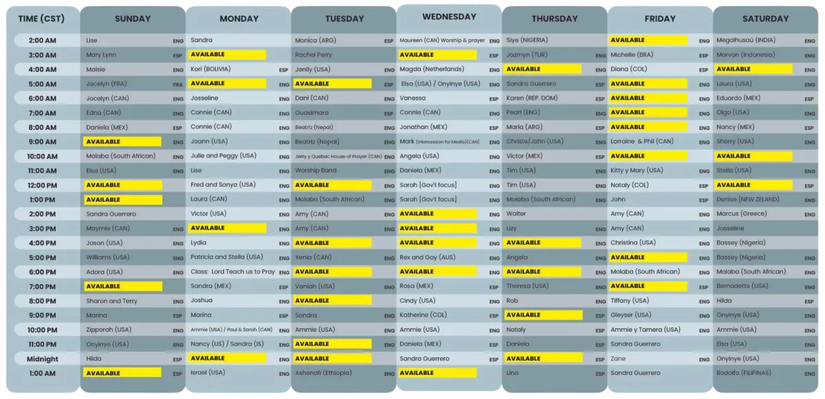 To ensure 24/7 prayer coverage, we’ve created a schedule that segments the week into 168 hours, each led by a dedicated Prayer Leader. These leaders encourage others to join them in their designated hour, fostering a powerful community of prayer. Our prayer meetings are conducted via Zoom, so Leaders can join from anywhere in the world! If you’re interested in leading a one-hour prayer segment each week, please fill out the brief form below. A member of our team will be in touch with more details soon!